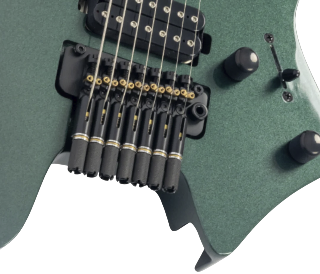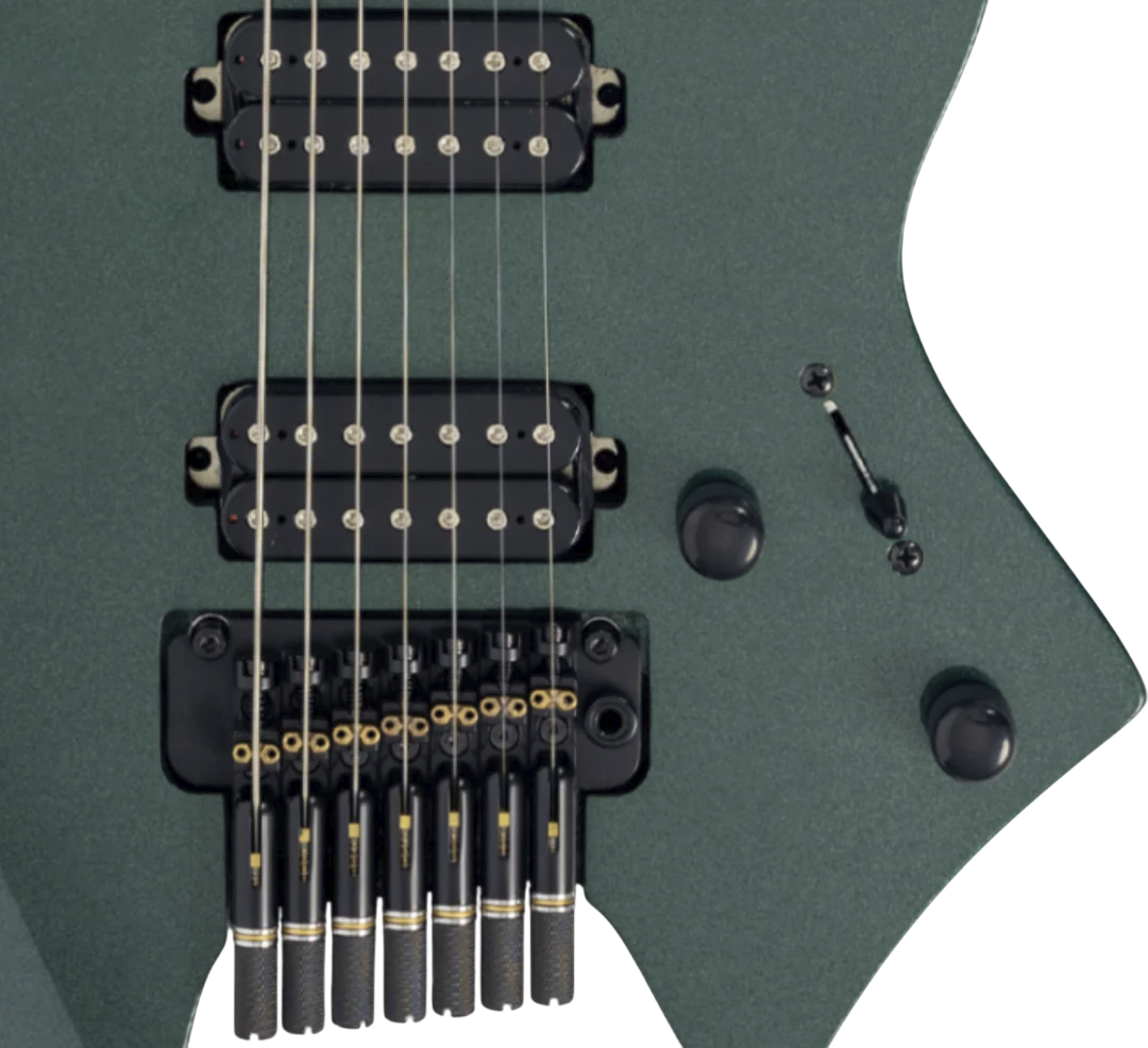 A bridge system designed for the new 7-string Sire headless guitar, featuring tuners beneath the bridge plate that promote precise tuning stability and improved tone and sustain.