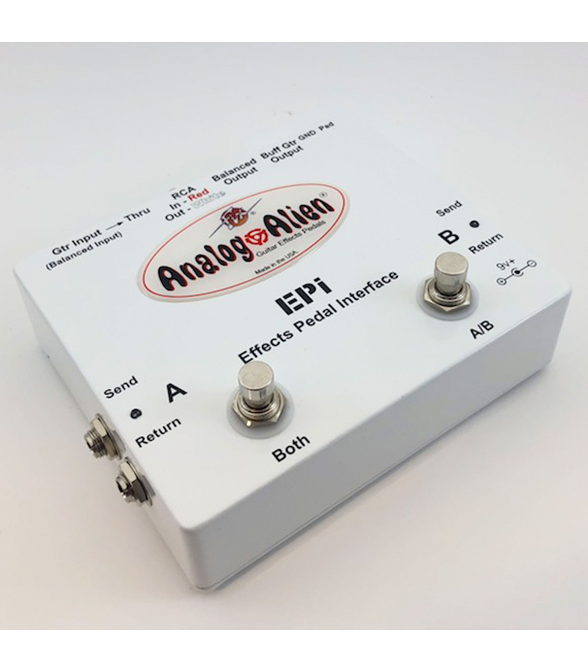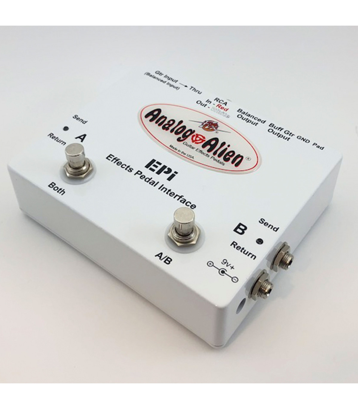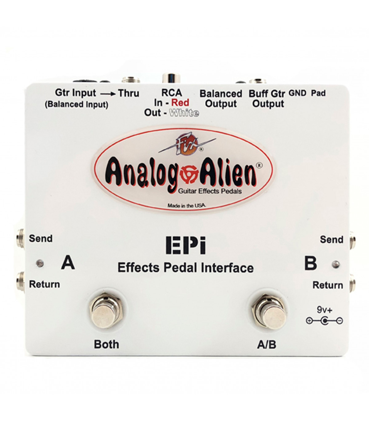 The EPi is a high-end routing pedal that lets you take your effects signal and record it directly into your DAW or analog tape recorder; professionally designed with no signal or fidelity loss. The EPi also features RCA -10dBu inputs and outputs for connection to non-professional signal operating levels. By adjusting the impedance and voltage levels coming from your effects pedals, and properly interfacing with professional recording studio levels, the Analog Alien EPi allows you to use your effects pedals in ways you never imagined.