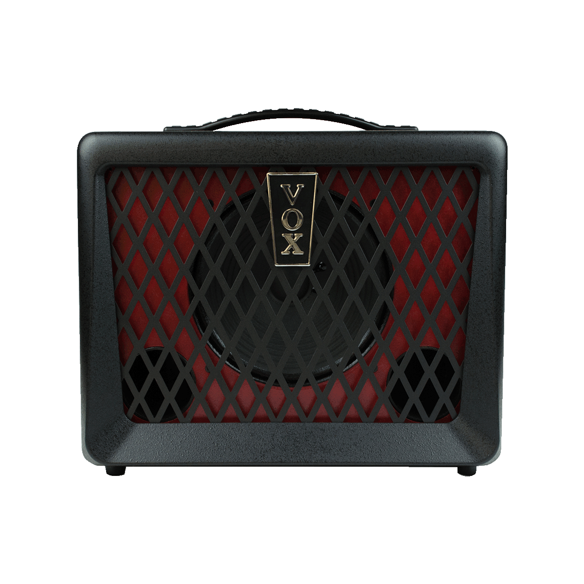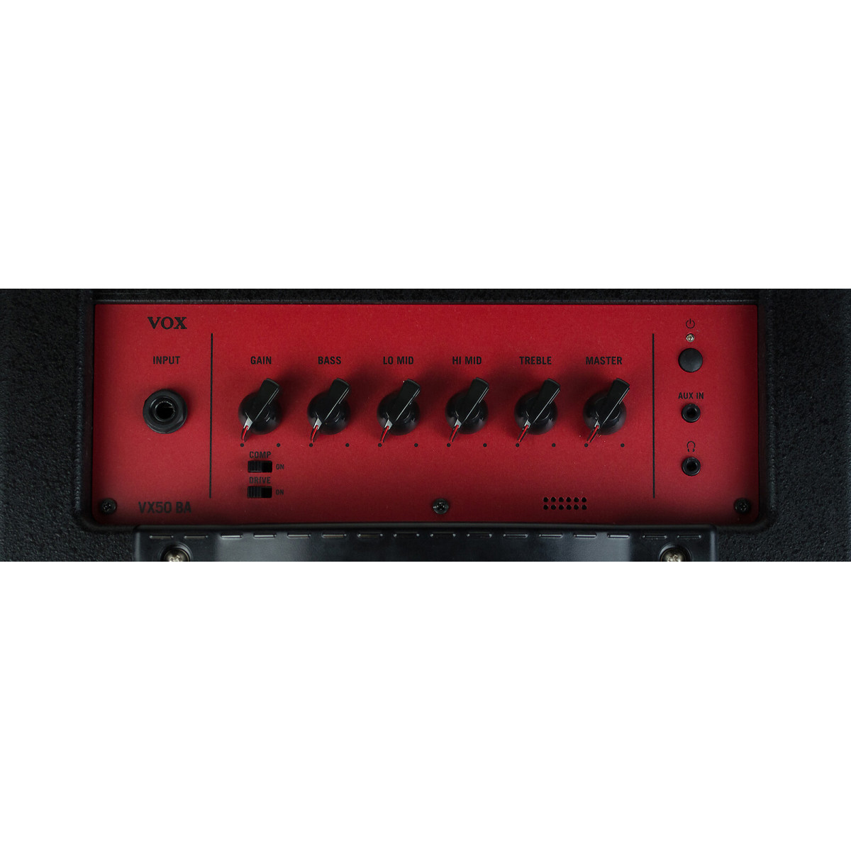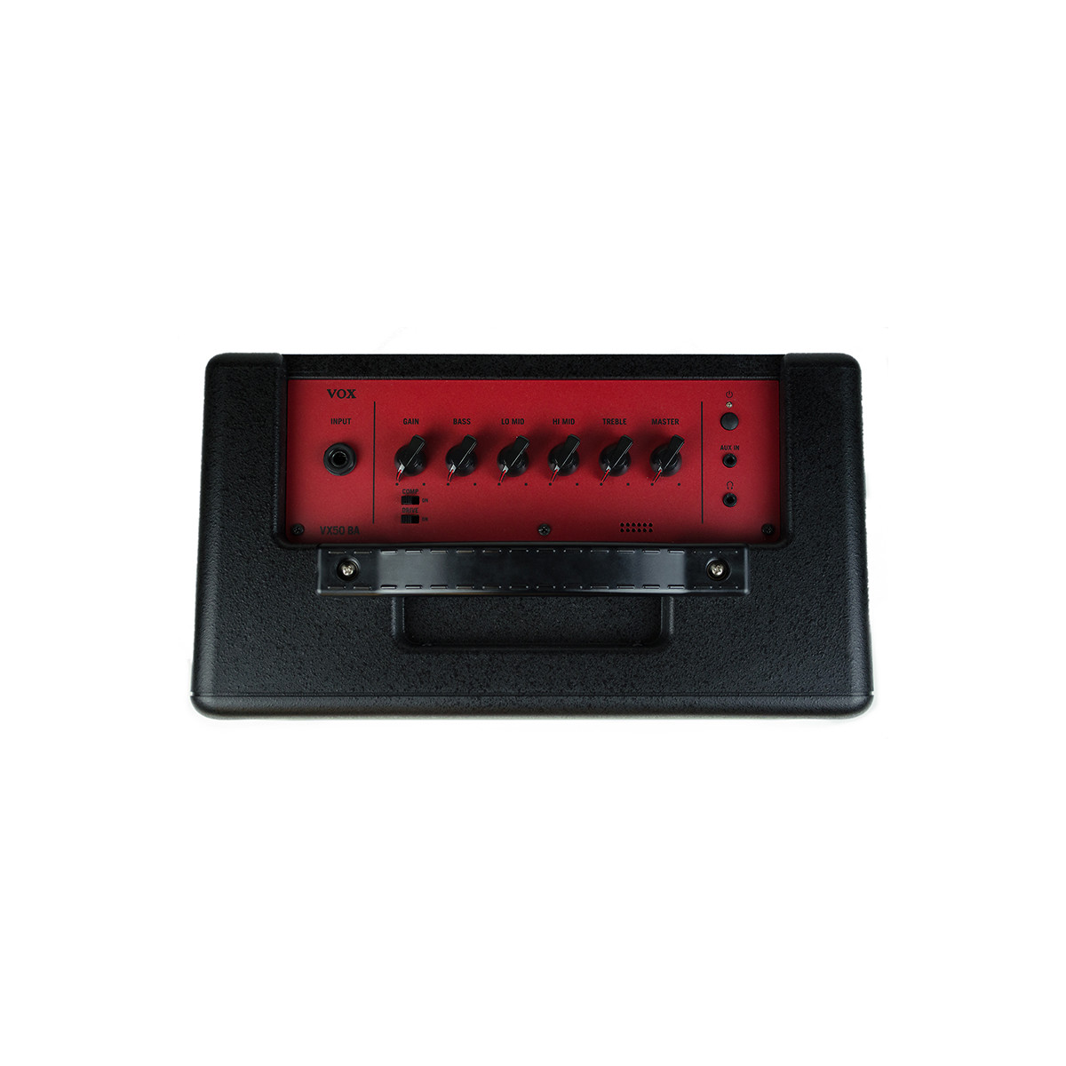It also offers a four-band EQ for detailed sound shaping, an essential compressor effect for bass, and a overdrive effect that ranges from subtle tones to high-gain distortion. A comprehensive set of input/output connections is included, such as an AUX IN, headphone jack, and DIRECT OUT for direct connection to your PA system. Visually, the VX50 BA features a striking red color scheme, a traditional vertical VOX logo, and a metal grille for a distinctive, modern look.