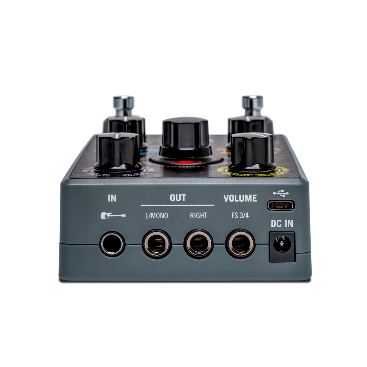 - Connections: Input (6.3 mm jack), stereo outputs (6.3 mm jack / L for mono), stereo headphone output (3.5 mm jack), footswitch connection, USB-C, headphone volume control