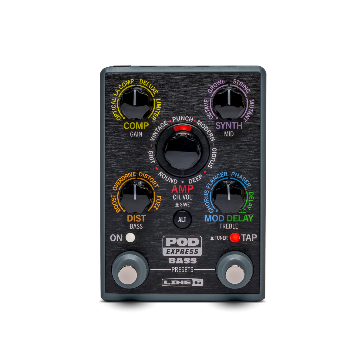 The simple controls make it easy to operate, while the modeled tones, part of the HX processor family, ensure exceptional sound quality and authentic feel. POD Express Bass offers seven amplifier models, seven cabinet simulations, and 17 effects including distortion, compression, synthesizer, modulation, and delay (including a looper). It can run on three AA batteries (included) or an optional 9V power supply.