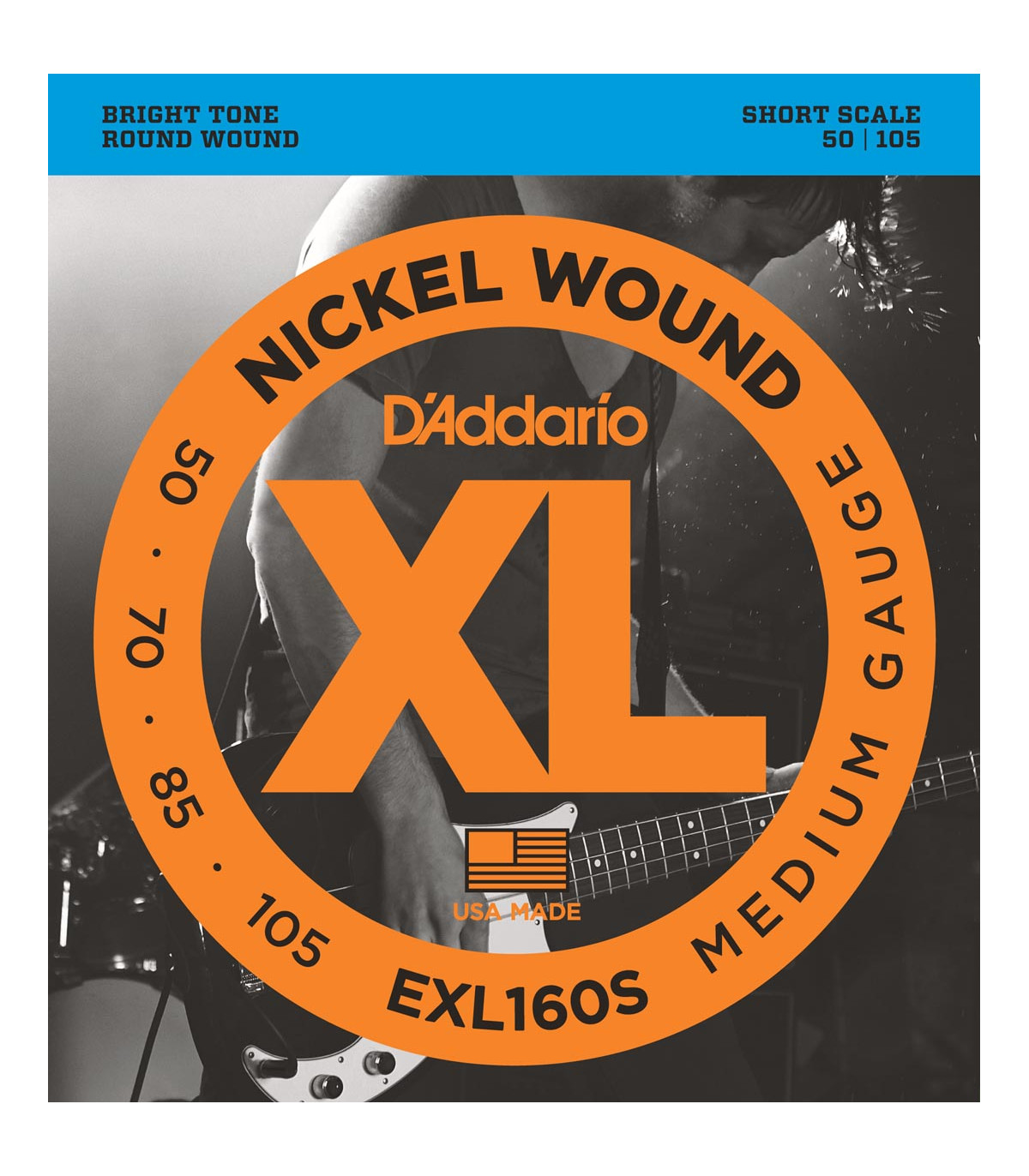 D’Addario EXL160S Medium Short Scale Electric Bass Strings [50-105] (050 - 070 - 085 - 105). D’Addario XL Nickel bass strings are globally renowned as the bassist’s choice, regardless of the style played. The XL strings are precisely wound with nickel-plated steel over a hex-shaped core, resulting in strings with a distinctive, bright tone and excellent intonation. The nickel-plated steel wire wound around the core is known for its characteristic bright sound and reliable tuning across all styles.
