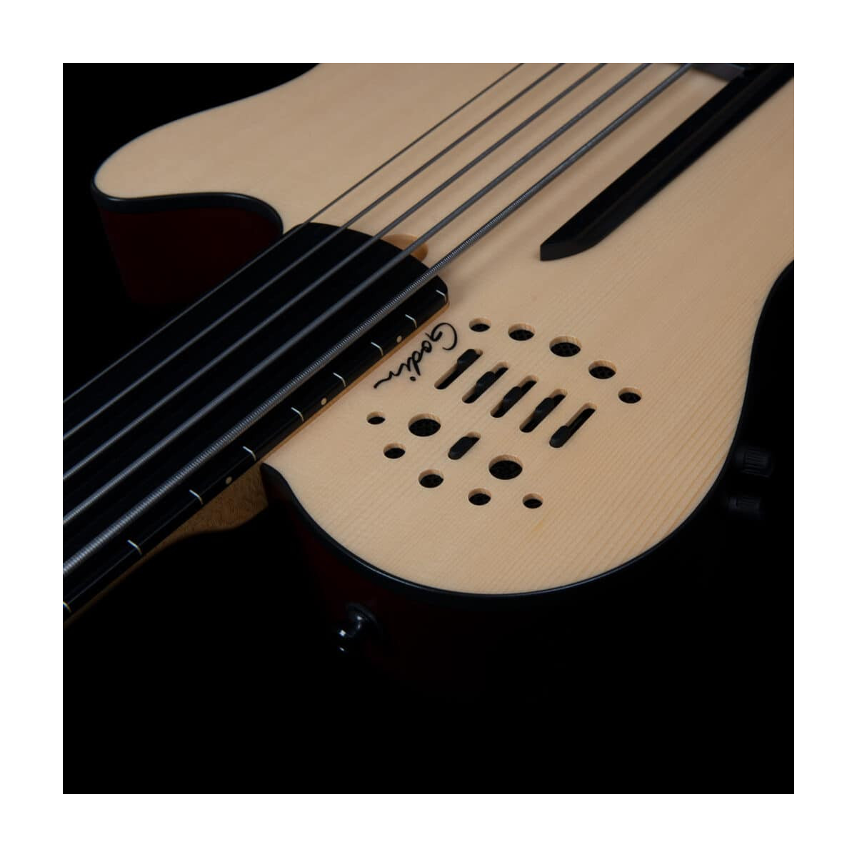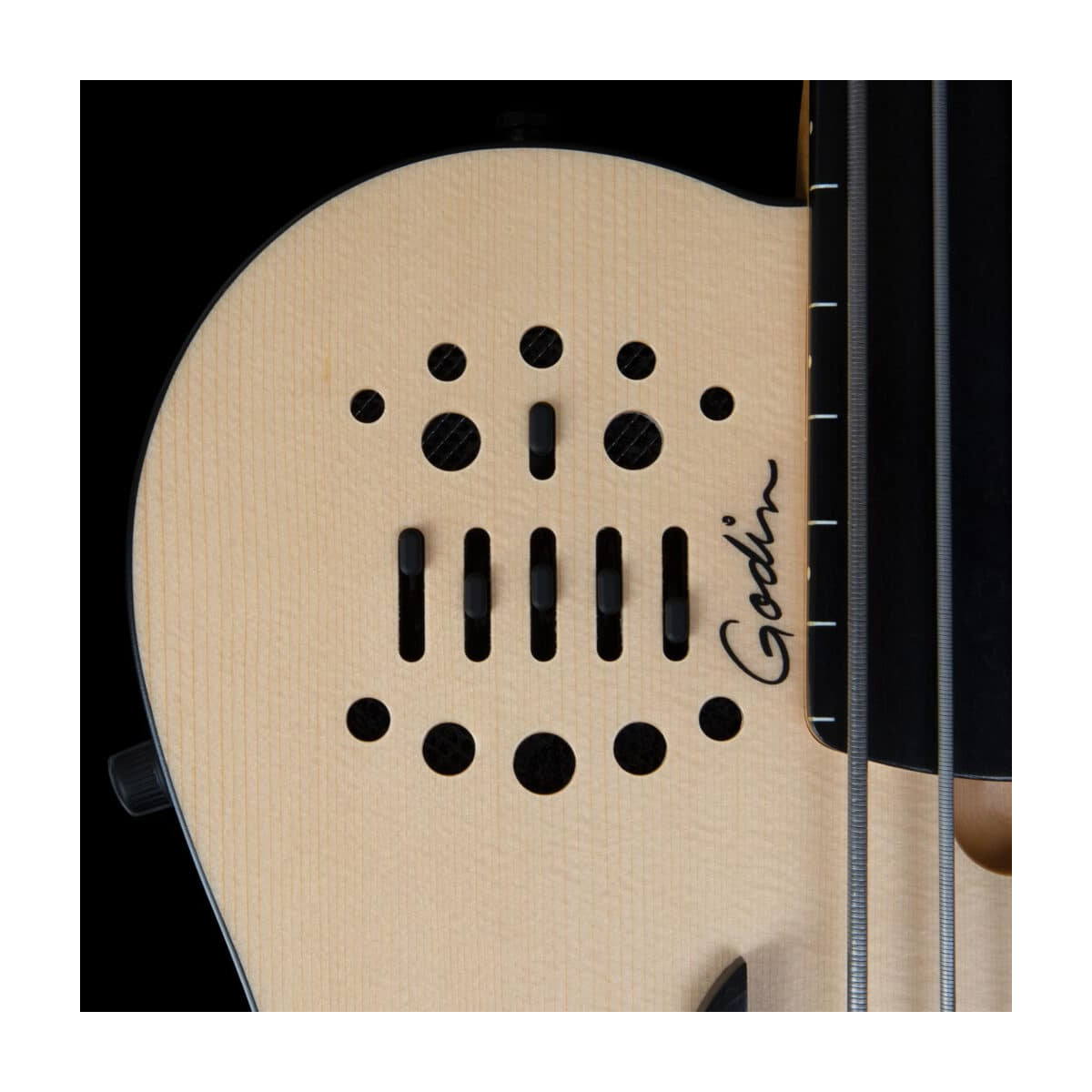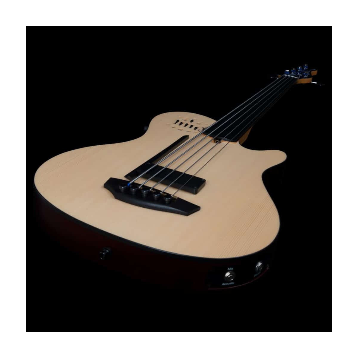 The semi-acoustic A5 bass features a Canadian basswood body with dual chambers, a solid spruce top, a maple neck, and a Richlite fingerboard. The A5 also includes a thumb rest mounted on top of the top for comfortable playing position. What sets the A5 apart is its dual-voice pickup system with integrated controls.