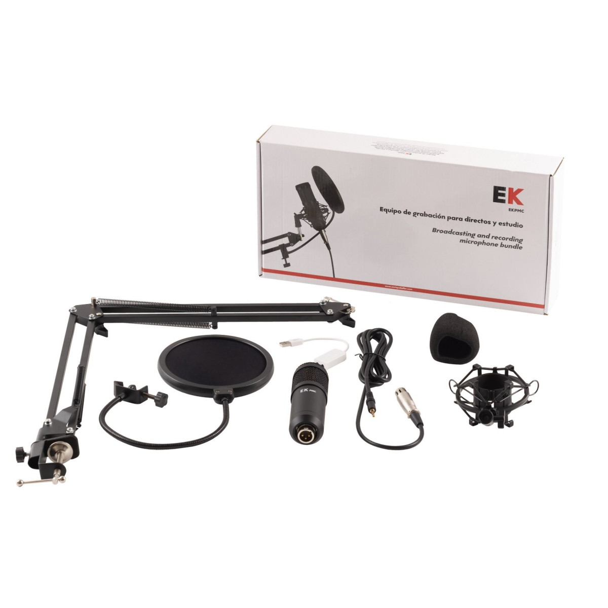 This set is particularly ideal for recording or live streaming. It includes a condenser microphone with its desktop stand and a spider shock mount. Cables, windshields, and a USB interface are also included.