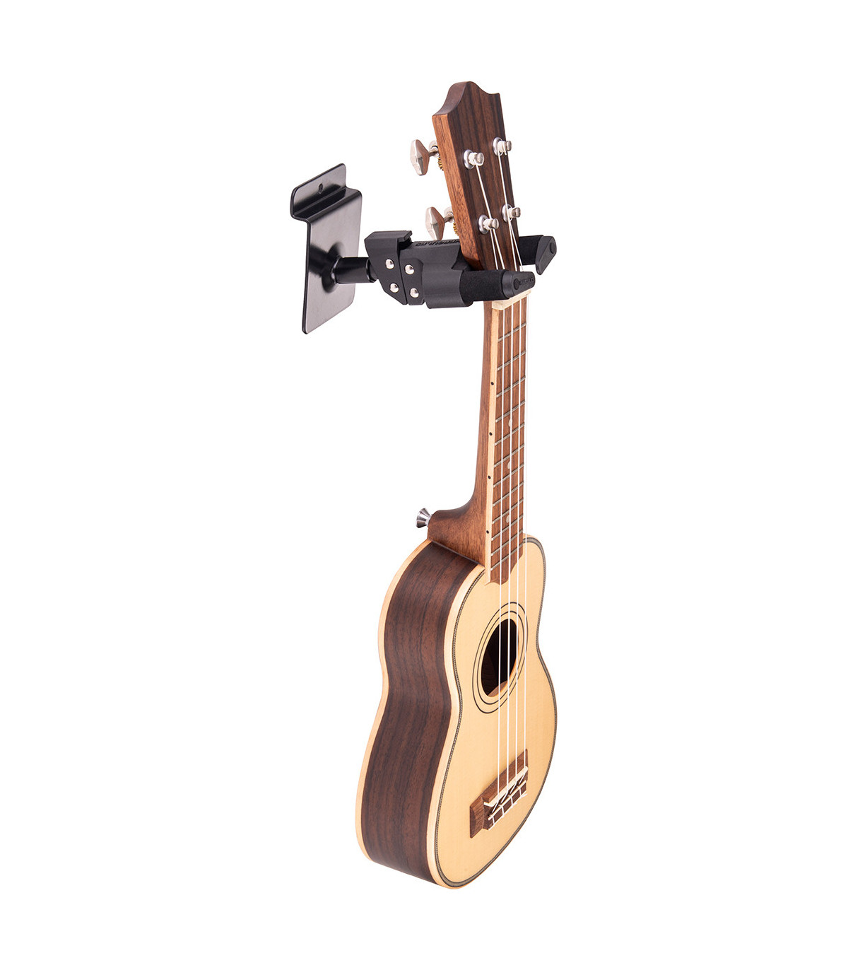 Ukulele wall mount for wood slats. The AGS Auto Grip System allows for multi-angle adjustments while securely locking the instrument in place. Perfect for all sizes, from soprano to guitarlele