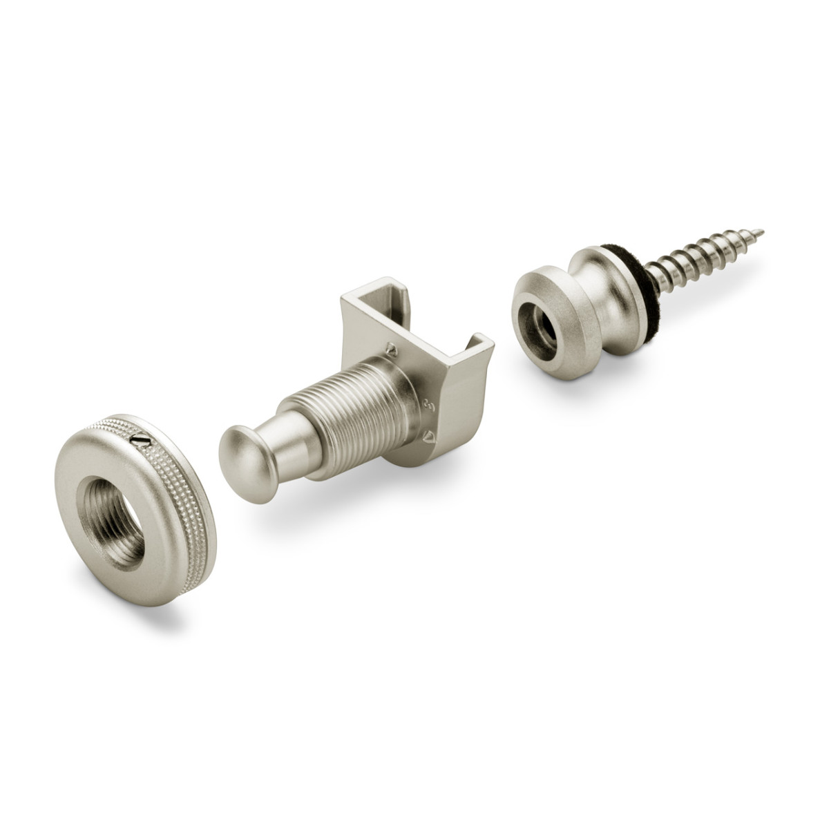 The new Schaller Security S-Lock can be installed manually, both the strap pivots with their felt washer in the existing holes of your guitar using a 3 mm Allen wrench (1/8"). Make sure the strap pivots are fully seated into the wood. The final step is to attach the new nut, designed for hand installation. Use an Allen wrench to tighten if necessary and adjust its security screw so it never moves.