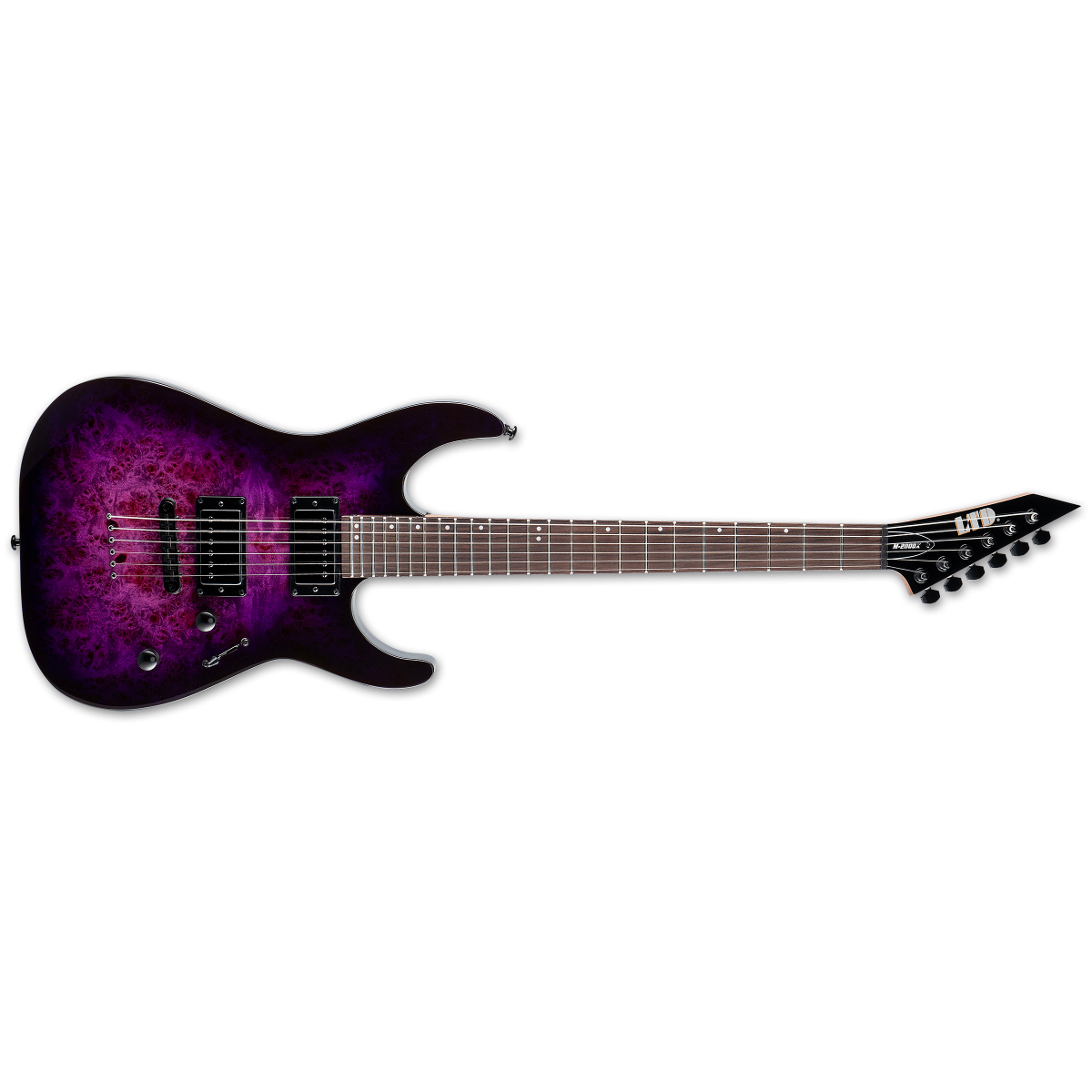 The DX series from LTD offers musicians access to a high-quality guitar at a price significantly lower than what its impressive features would suggest. The M-200DX features the sleek M-shaped body and adds a stunning burled poplar top on its lightweight, resonant ash body. Built with a 25.5" scale length, the M-200DX includes premium features such as a roasted maple neck, rosewood fingerboard, black chrome hardware, a TOM-style bridge with string-through-body design, body binding, offset dot inlays, and an in-line reversed tuning machine head.