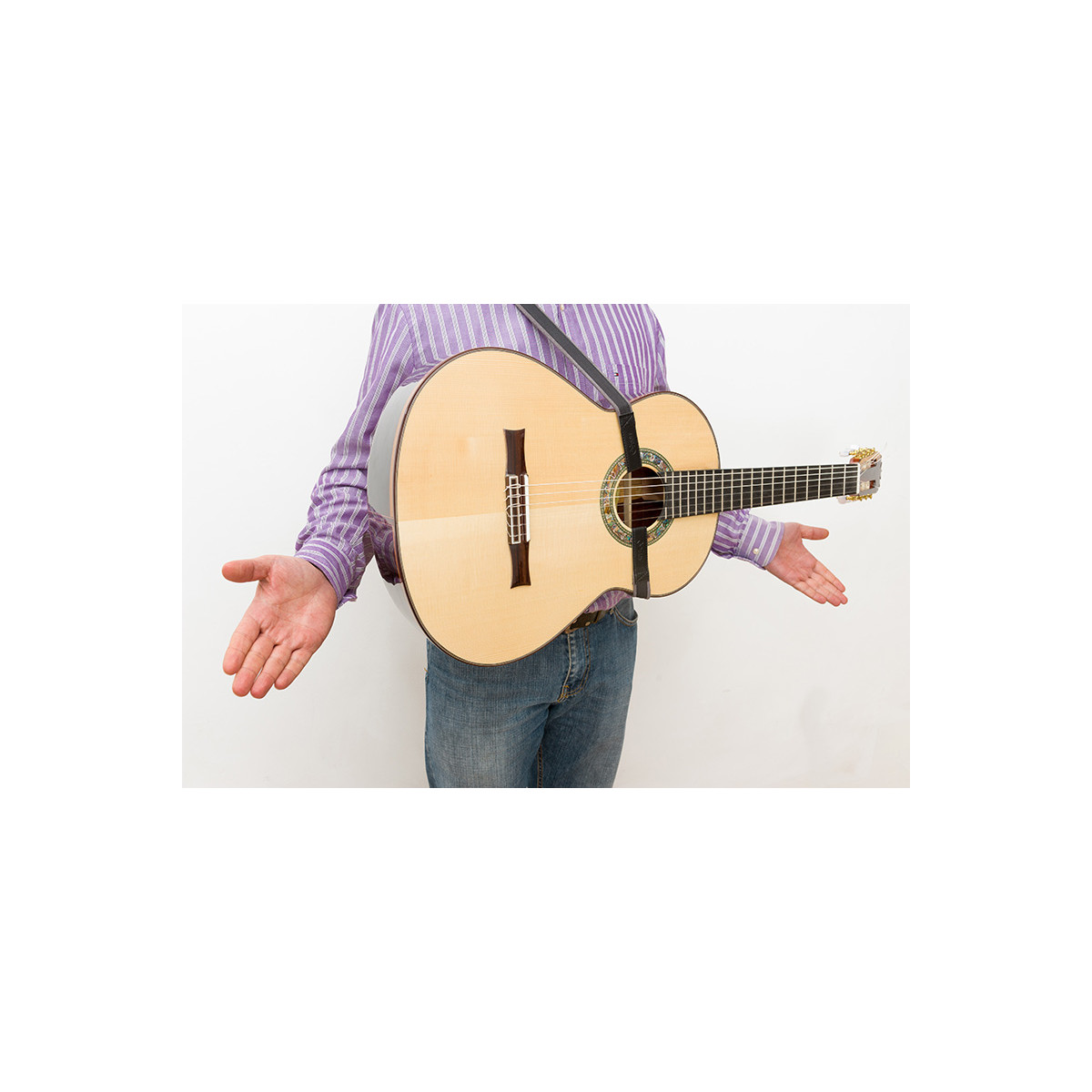 Las guitarras acústicas clásicas no están equipadas con pasadores de correa. Sin embargo, Righton Straps ofrece varios diseños de correas específicamente para estas guitarras. Cada correa consta de un lazo cerrado que se lleva alrededor del cuello. Pasa el cordón por detrás y por debajo de la guitarra a la altura de la cintura, y vuelve a subir por delante hasta la boca. Enganche el gancho de plástico en la parte inferior de la boca. Tenga en cuenta que, al utilizar una correa de guitarra clásica en una guitarra clásica, el intérprete debe mantener en todo momento al menos una mano sobre la guitarra para evitar que se incline hacia adelante y se caiga.