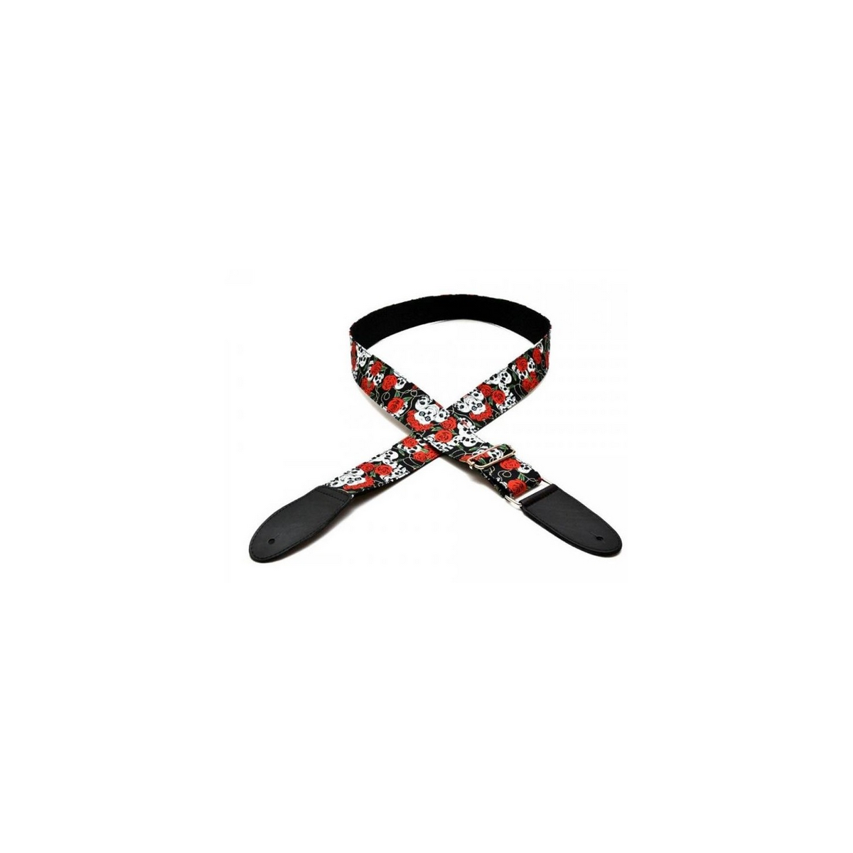 Elegante modelo de correa textil realizada completamente a mano con motivos de calaveras y rosas. Con un bonito patrón de colores blanco, rojo y matices verdes sobre fondo negro, proporcionará un estilo distintivo a tu instrumento.