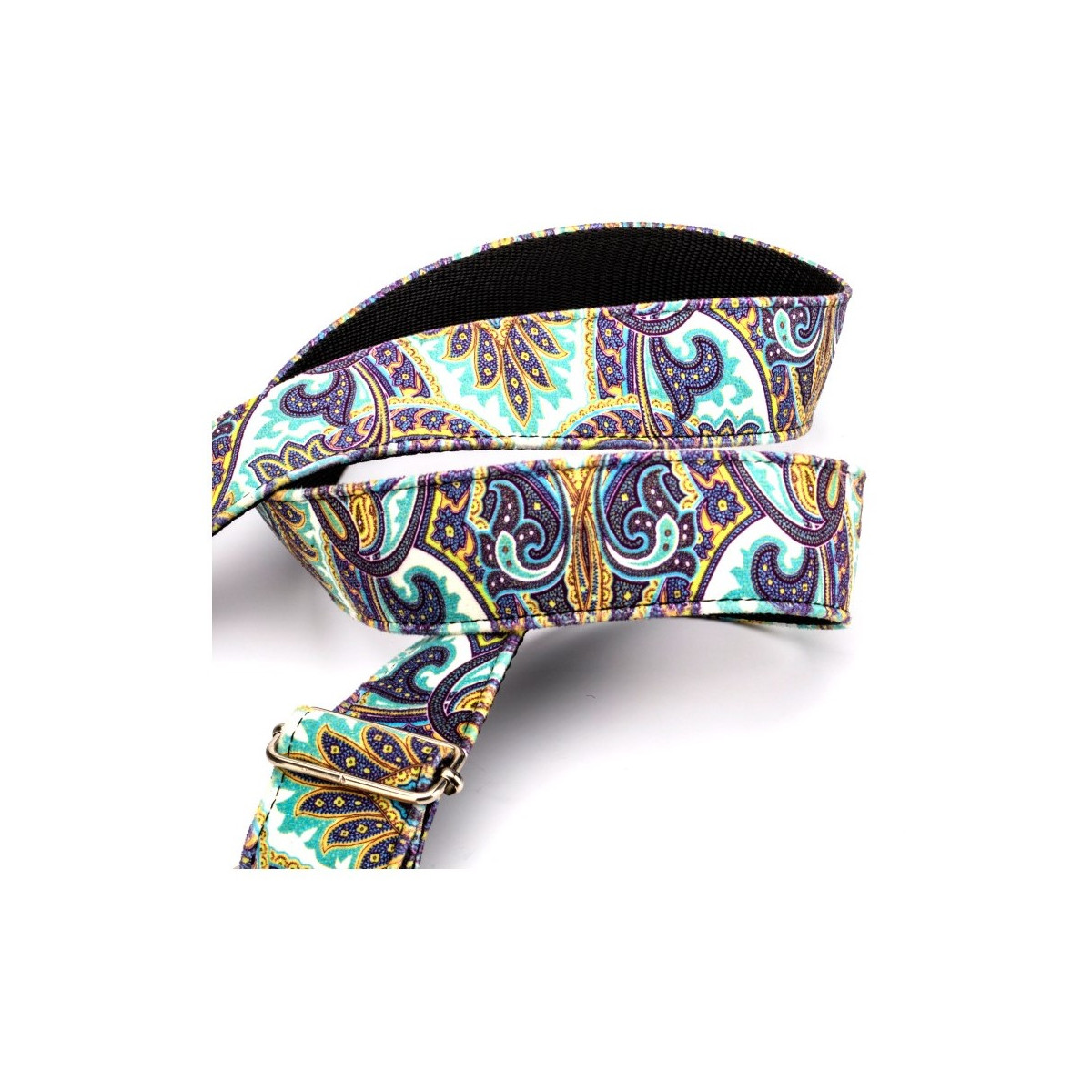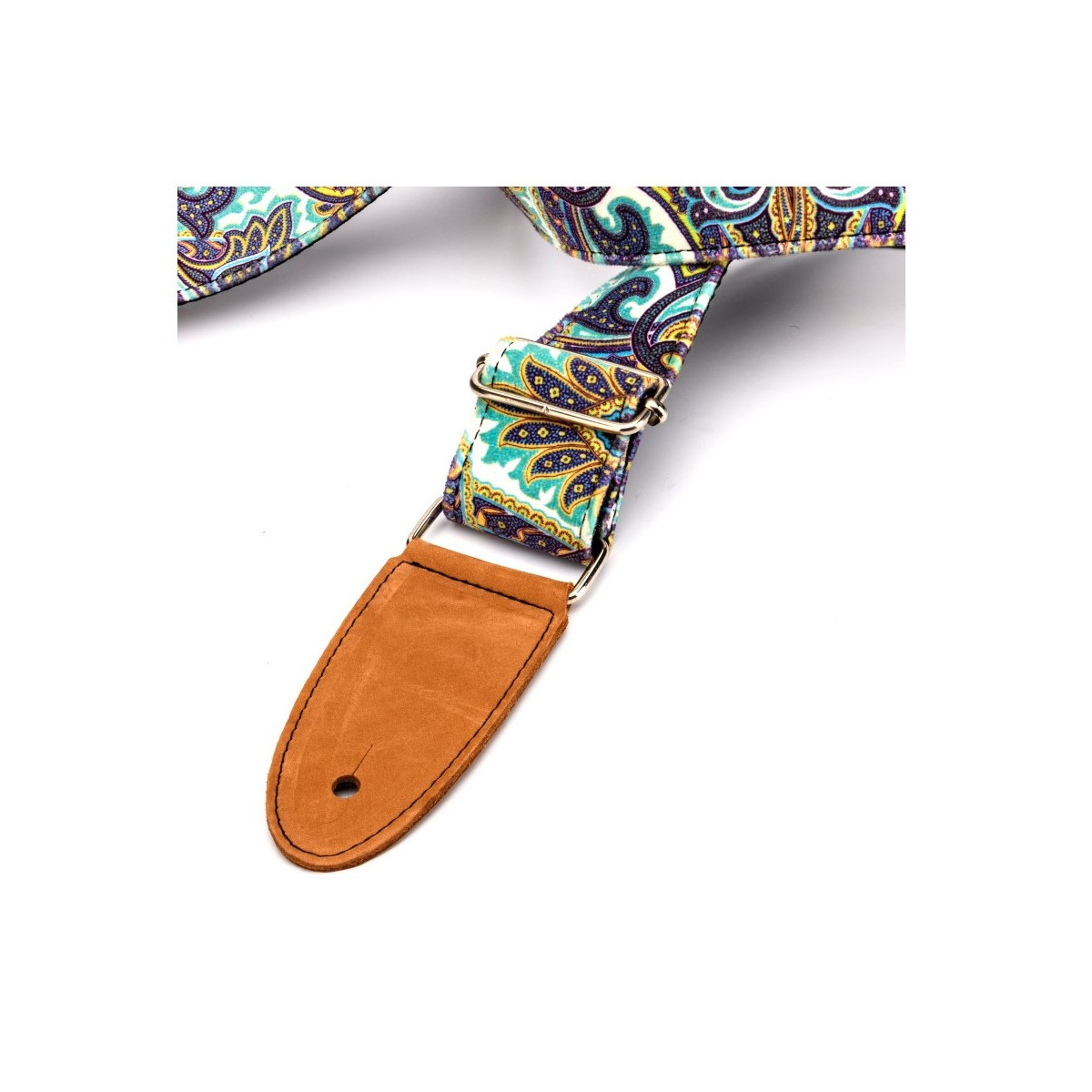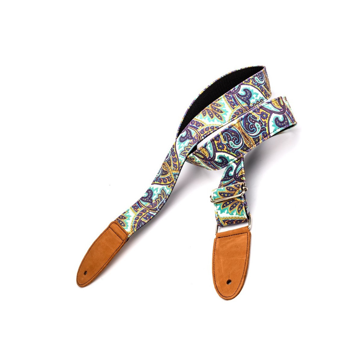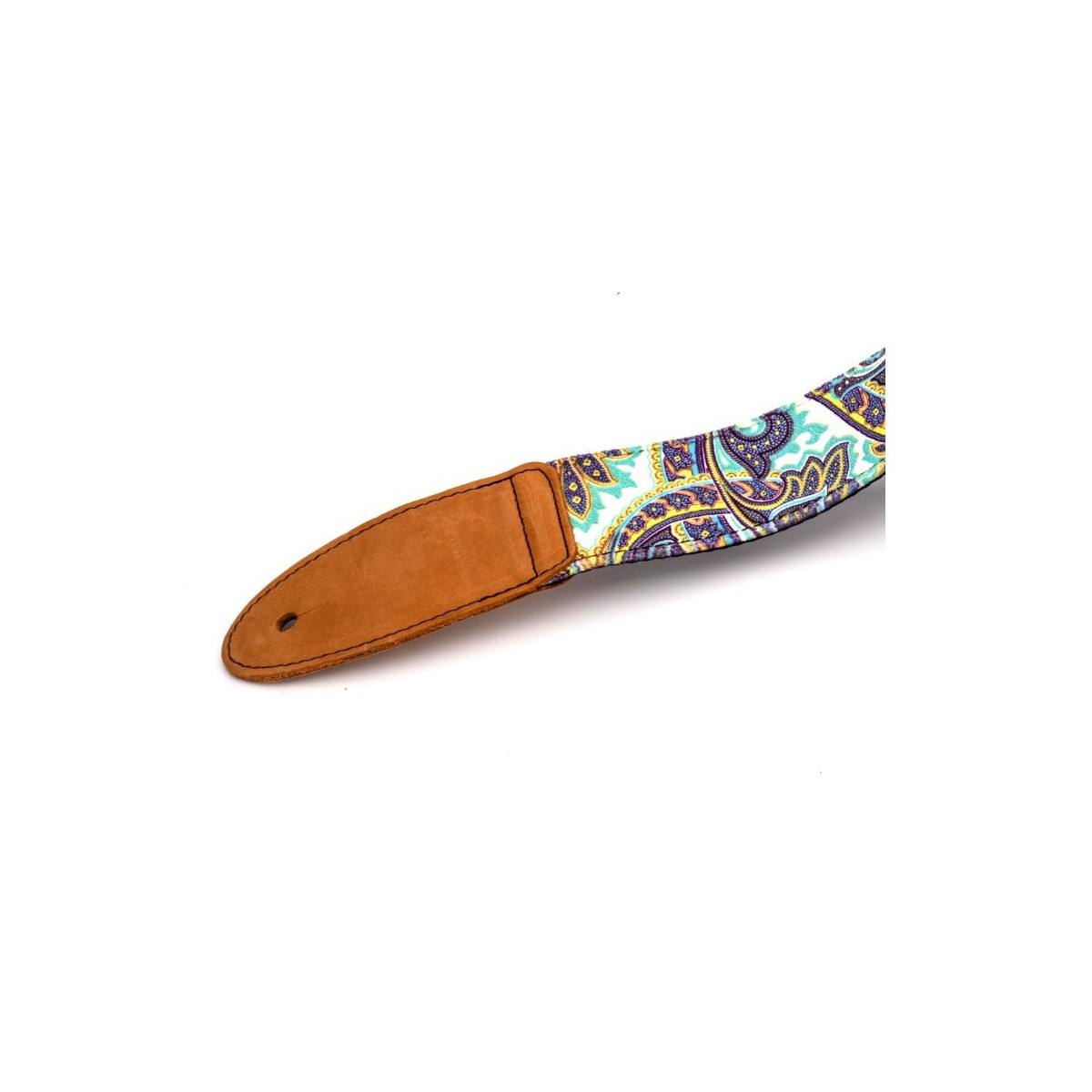 El modelo VIOLET de la serie VELVET es una elegante correa textil con fondo blanco y motivos en colores púrpura, verde y amarillo. Es una correa ideal para todos aquellos que buscan un estilo elegante y reluciente para su instrumento musical.