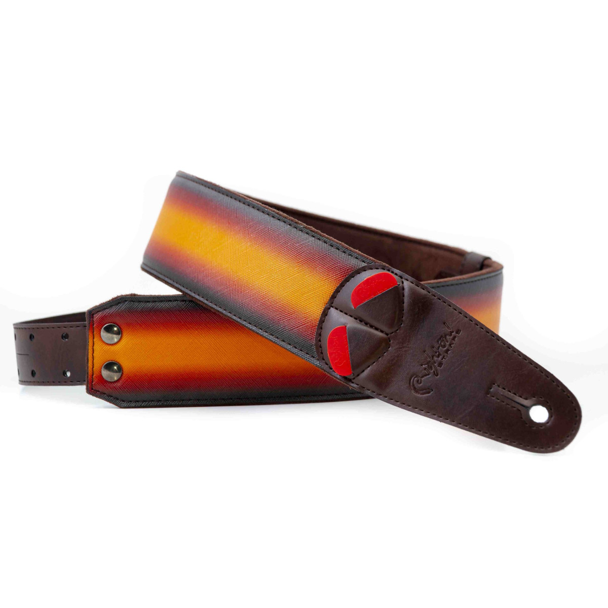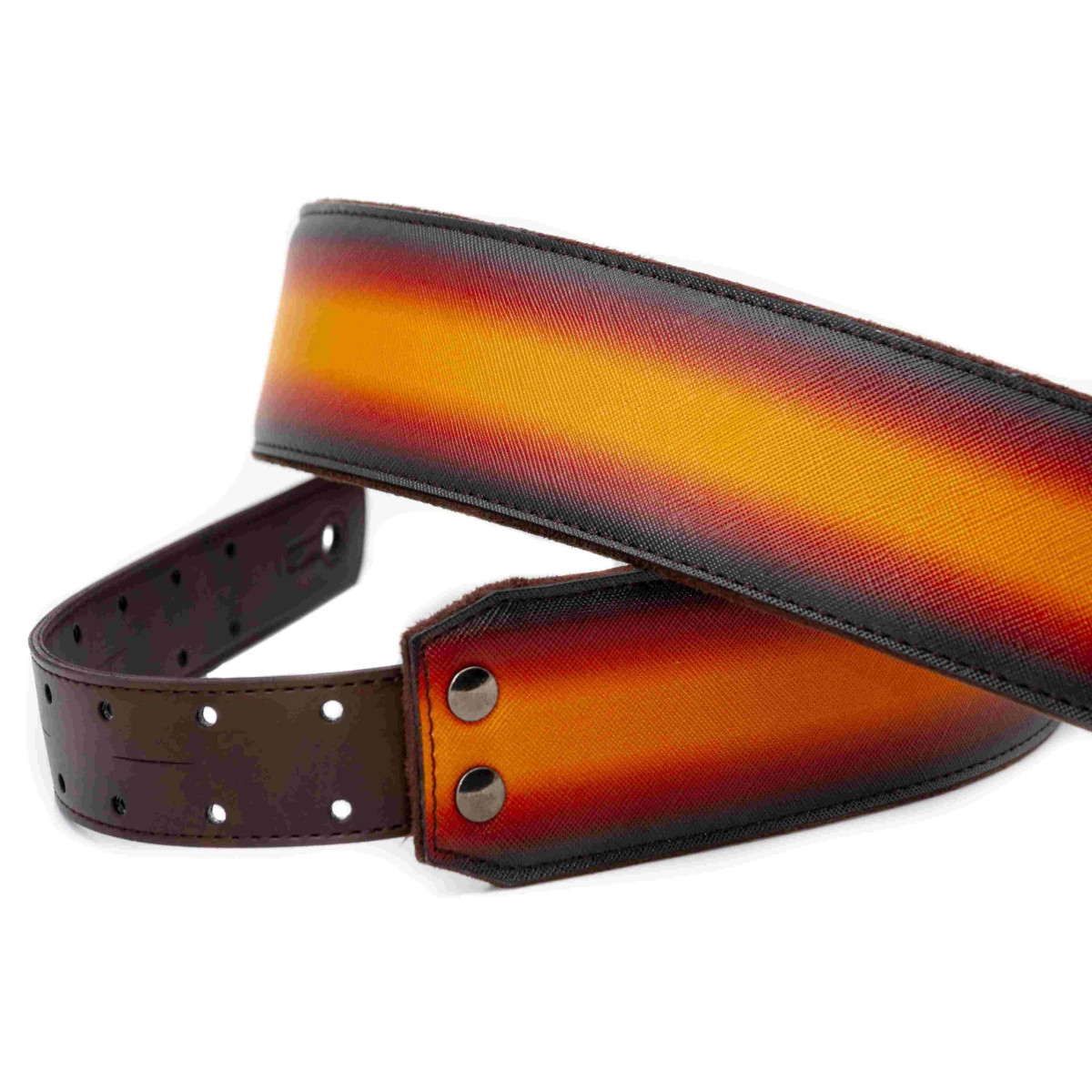 Nunca habías visto una correa como esta porque... ¡Es la primera! La superficie de la Sunburst está pintada a mano, creando un magnífico efecto de los rayos del sol en el atardecer. El acabado Sunburst está presente en muchas guitarras, ya era hora de que lo estuviese también en una correa.