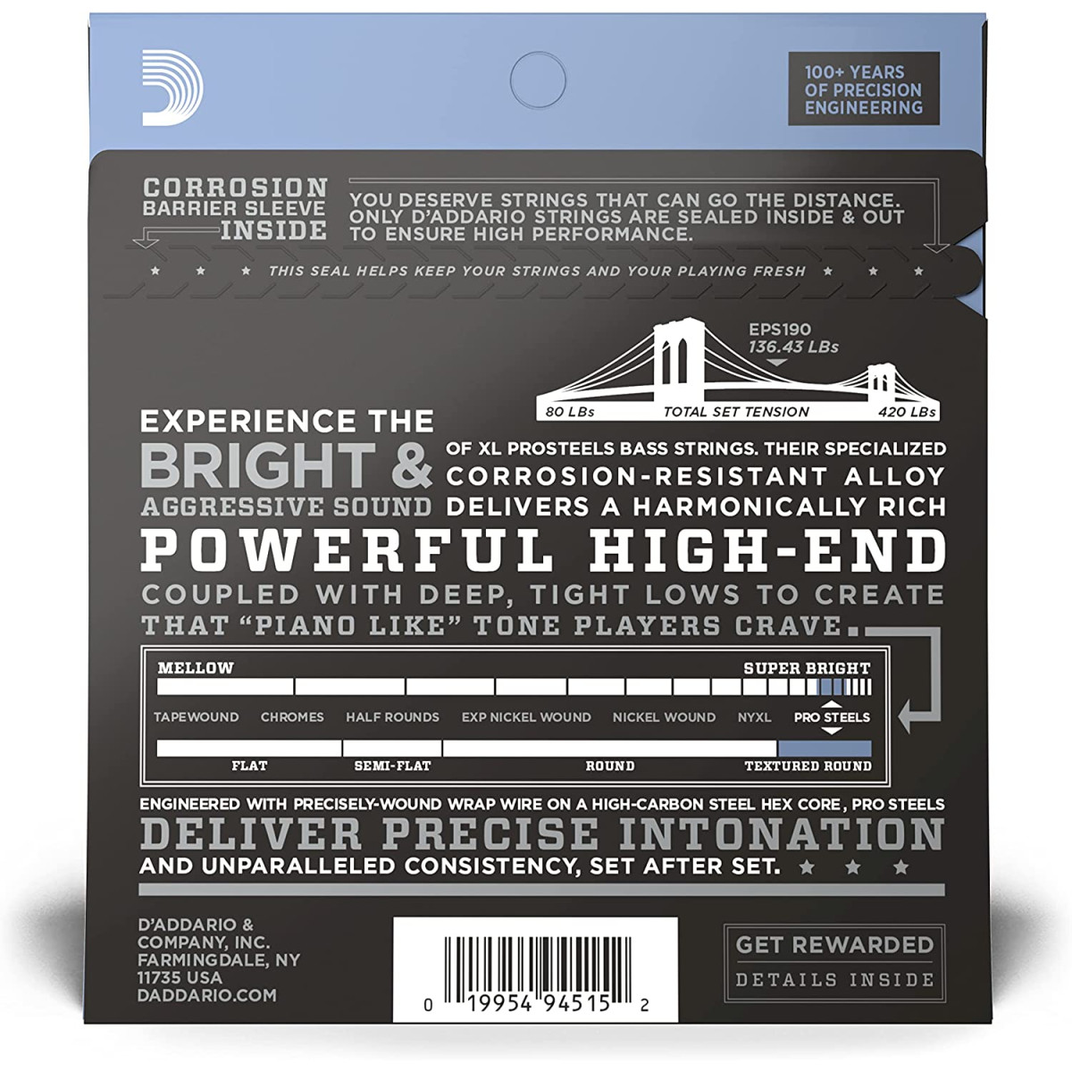 Pack de cuerdas para bajo eléctrico Daddario EPS190 ProSteel.