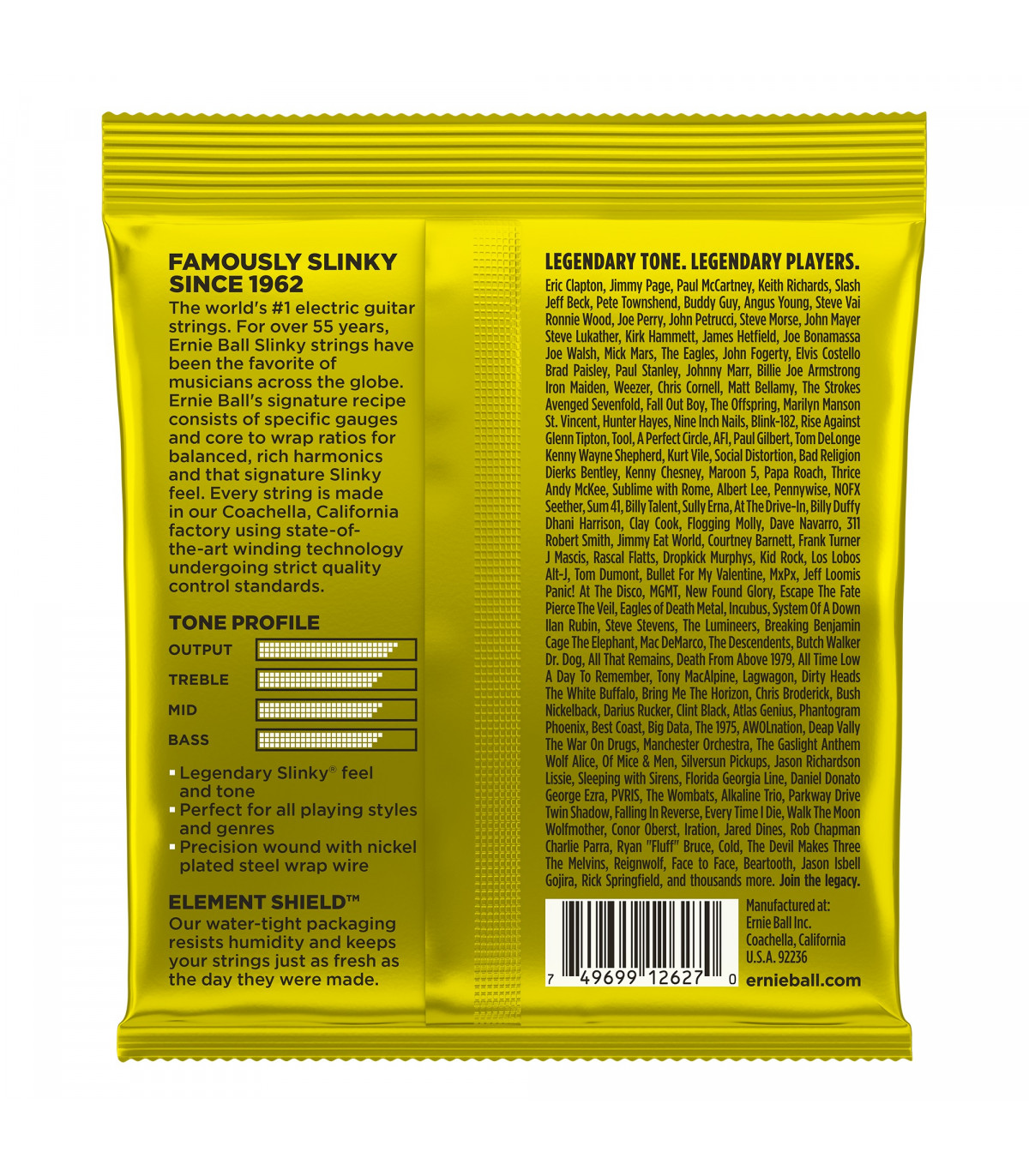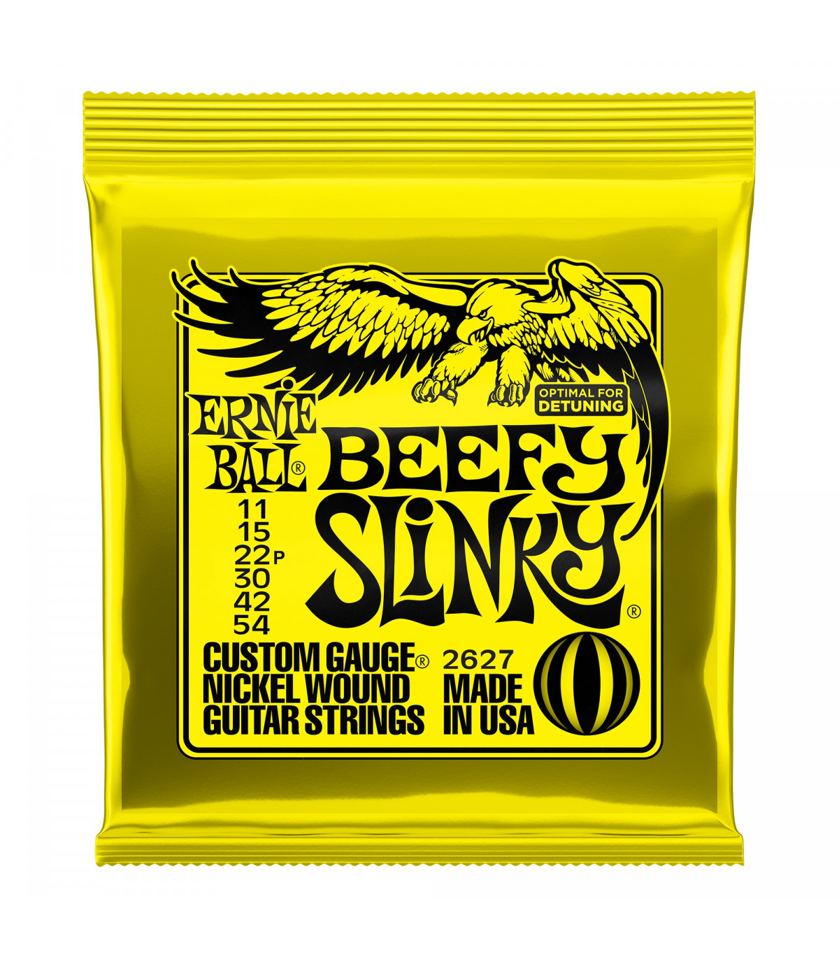 Juego de cuerdas EB2627 Beefy Slinky 11-54 de calibre .011 .015 .022p .030 .042 .054 óptimas para afinaciones bajas. Las cuerdas Ernie Ball Beefy Slinky son ideales para aquellos guitarristas que deseen afinar su insturmento en afinaciones alternativas por debajo del tono original y muchos