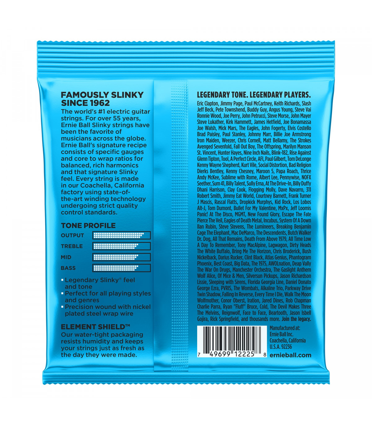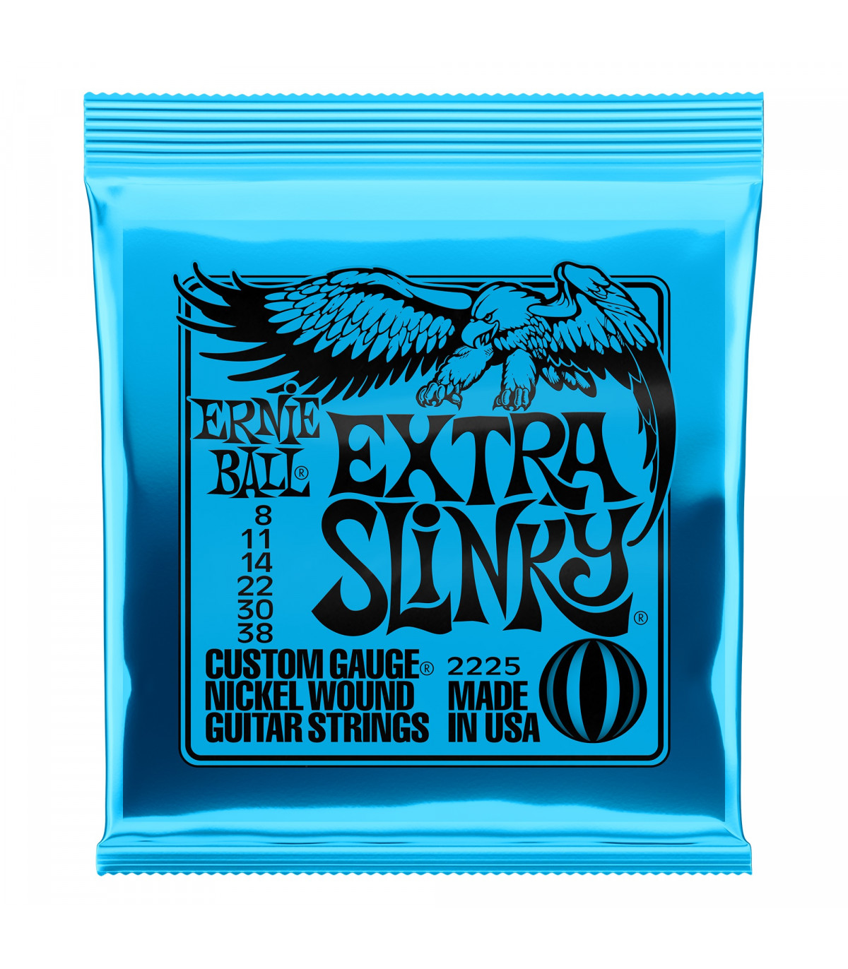 Juego de cuerdas para guitarra eléctrica de la serie Nickel entorchadas, la más popular con diferencia por su buen balance y su sonido rico en frecuencias. Extra Slinky Azul 8-38
