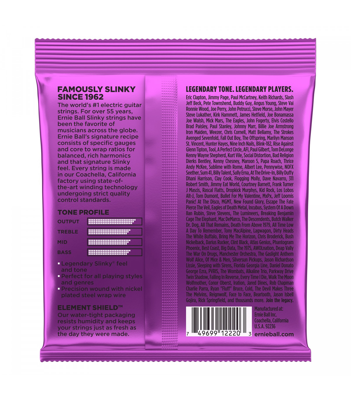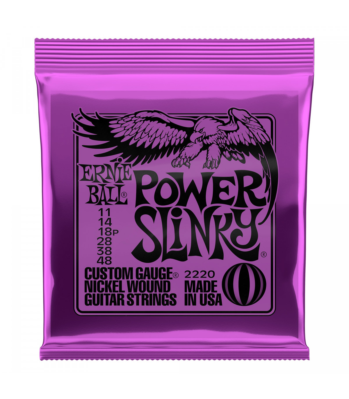 Juego de cuerdas para guitarra eléctrica de la serie Nickel entorchadas, la más popular con diferencia por su buen balance y su sonido rico en frecuencias. Power Slinky Violeta 11-48