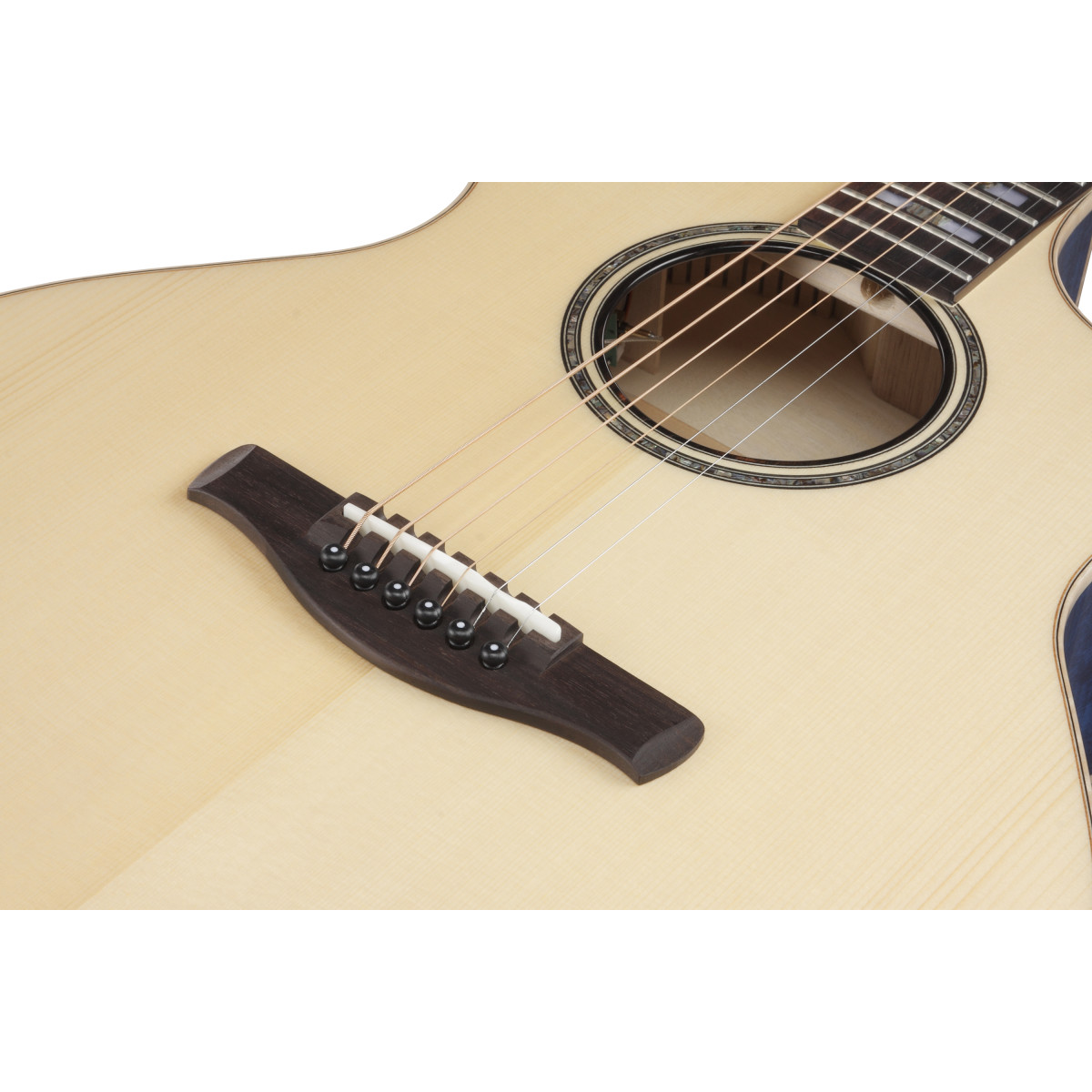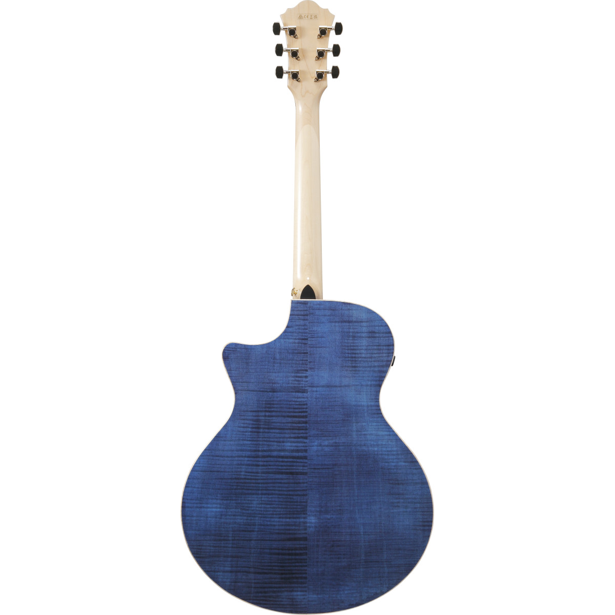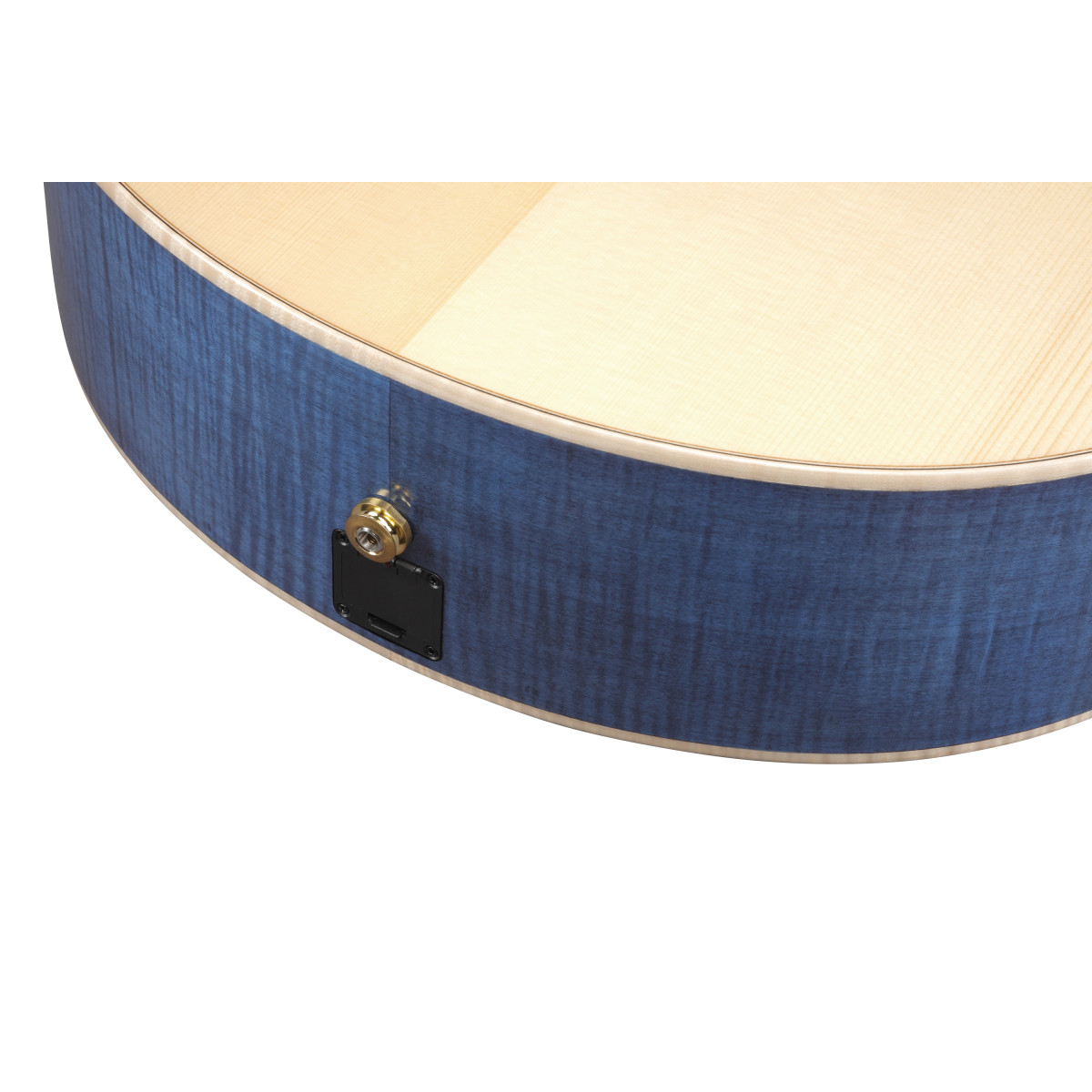 La guitarra Ibanez AE390 de la serie AE presenta un cuerpo con tapa sólida de abeto alemán con refuerzo cruzado, aros fondo de arce flameado con acabado gloss poly. La boca es redonda con roseta de abulón. Tiene un mástil de nato satinado con una escala de 651 mm (25.6") y un diapasón de palisandro de 20 trastes.