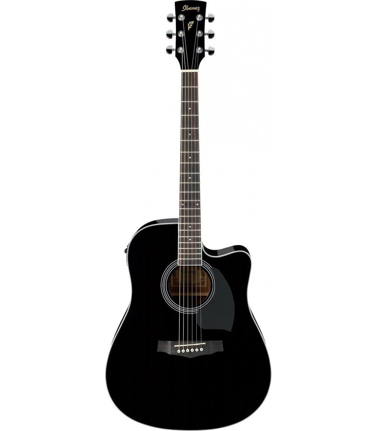 Guitarra acústica electrificada de la serie PF Black. Tapa de abeto - fondo, lados y mástil de caoba - diapasón y puente en palosanto - pastilla Ibanez Under Saddle - preamp Ibanez AEQ2T con afinador - cejuela y selleta de Ivorex II - calvijas puente Advantage - clavijero die cast cromado - golpeador negro - cutaway