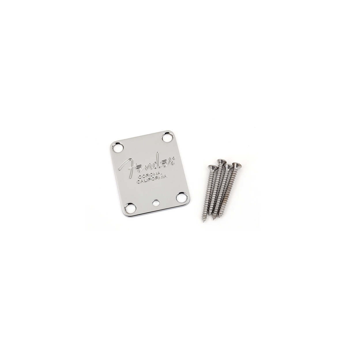 Placa de cuello cromada que incluye orificio para ajuste de inclinación del cuello. La placa del cuello dice "Fender Corona California". Sin número de serie. Herramientas de montaje incluidas. Se adapta a la mayoría de guitarras y bajos Fender que requieren un soporte de mástil de 4 pernos con ajuste Micro-Tilt.