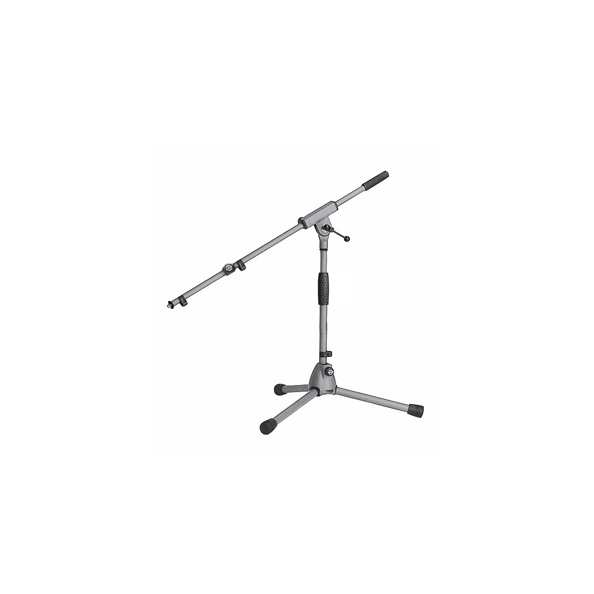 Soporte telescópico de bajo nivel con patas plegables. Viene con brazo de pluma de 2 piezas. Atractivo revestimiento en polvo gris Soft-Touch.